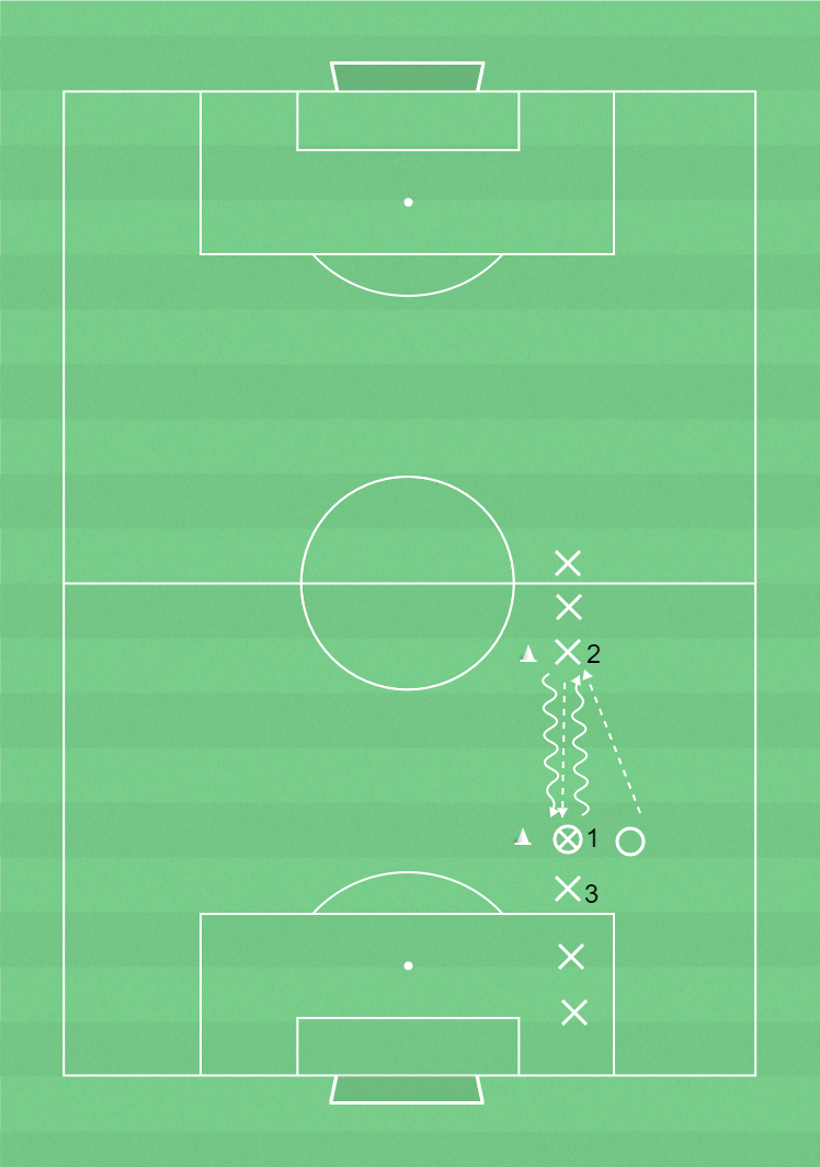 X1 lämnar över bollen till X2.