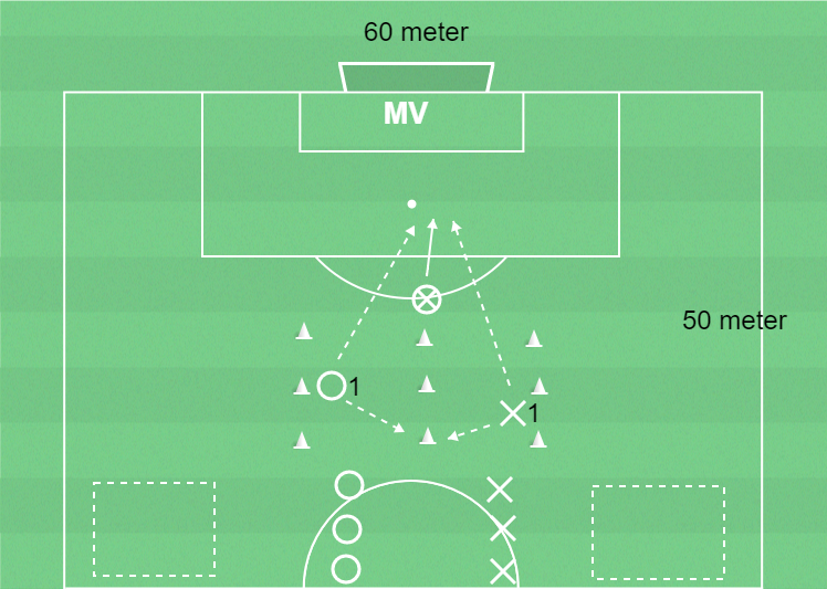 O1 ska försöka bryta och passa bollen till någon av ytorna på kanterna.