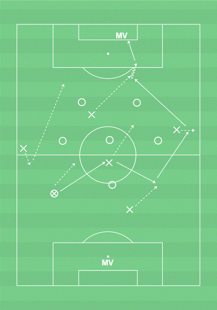 Ett lag väntar i försvarsformation medan det andra passar sig förbi försvarande lag och avslutar. Spring tillbaka till ett samlat 2-3-1. Laget som vilade hämtar snabbt en boll från mv och passar sig fram och avslutar. Snabbt tillbaka till 2-3-1.