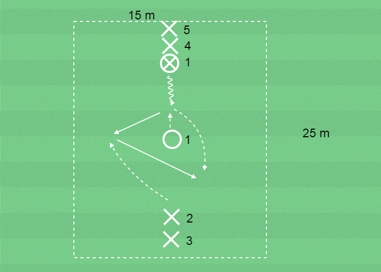 6 spelare, yta 25 x 15 meter, bollar, koner och västar.