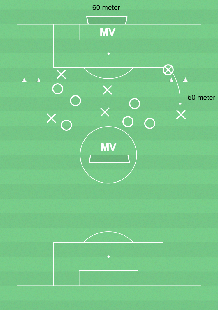 2 målvakter, 12 utespelare, spelplan 50 x 60 meter med 2 mål, bollar, koner och västar.