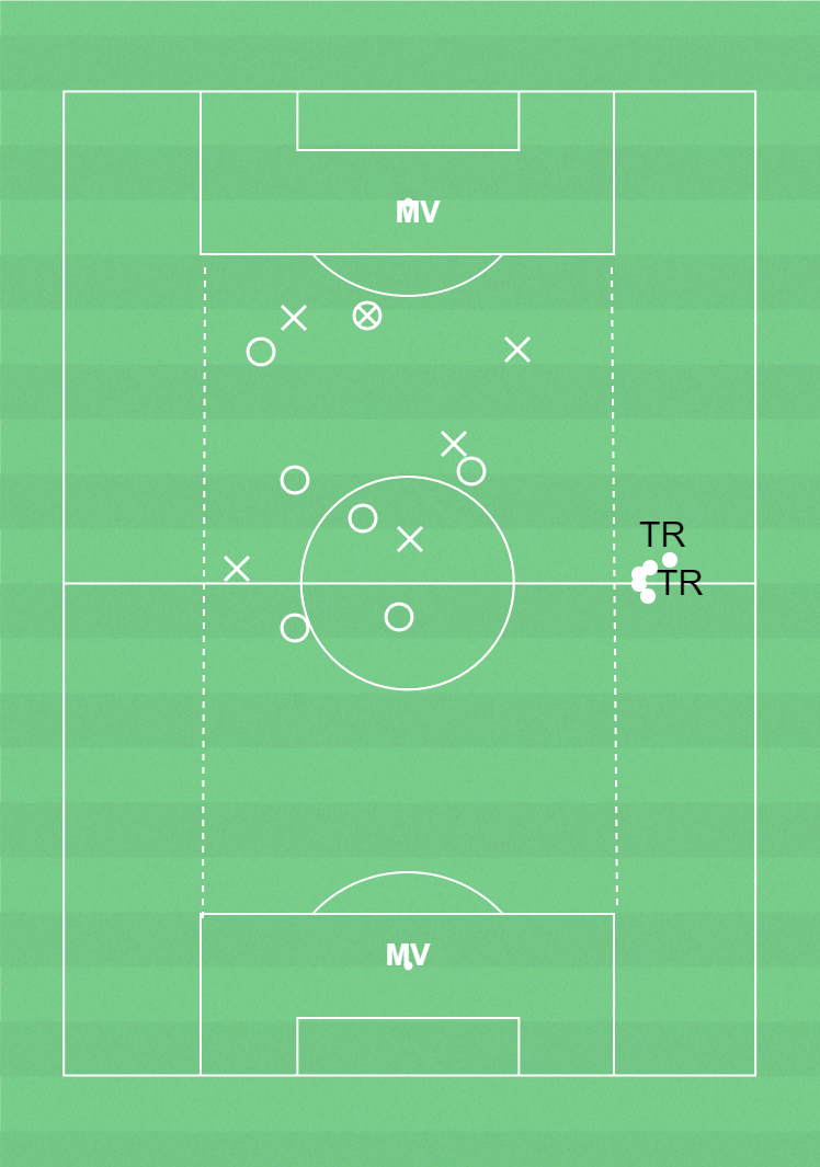 1 målvakt på varje kortsida. 2 lag har varsin boll som ska spelas från den ena målvakten till den andra. Alla spelare i laget måste haft bollen innan passning till målvakt.