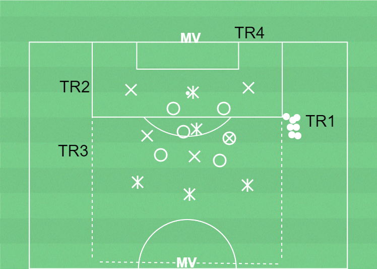 3 lag har var sin boll och passar bollen inom respektive lag. En MV på varje kortsida. Uppgiften är att spela bollen inom laget från MV till MV. Alla spelare i laget måste ha bollen innan passing till MV. Integrera övningar för förberedelseträning i övnignen (en övning i taget).