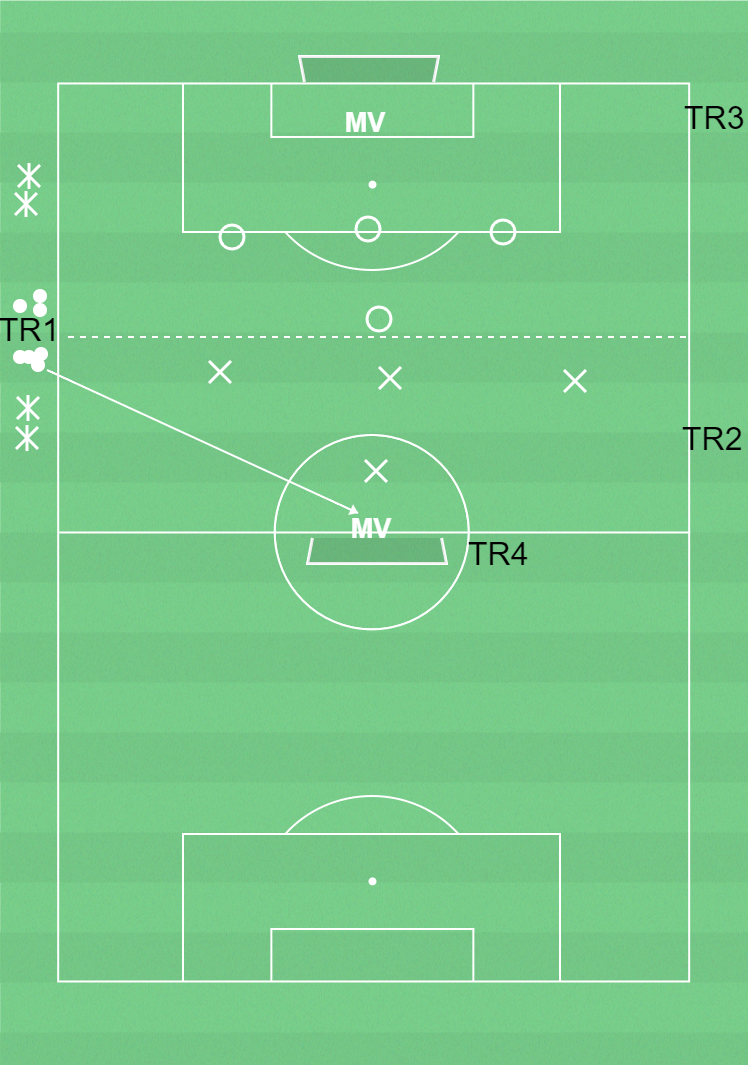 2) Forward styr mot en sida av planen. Laget flyttar över mot bollsida