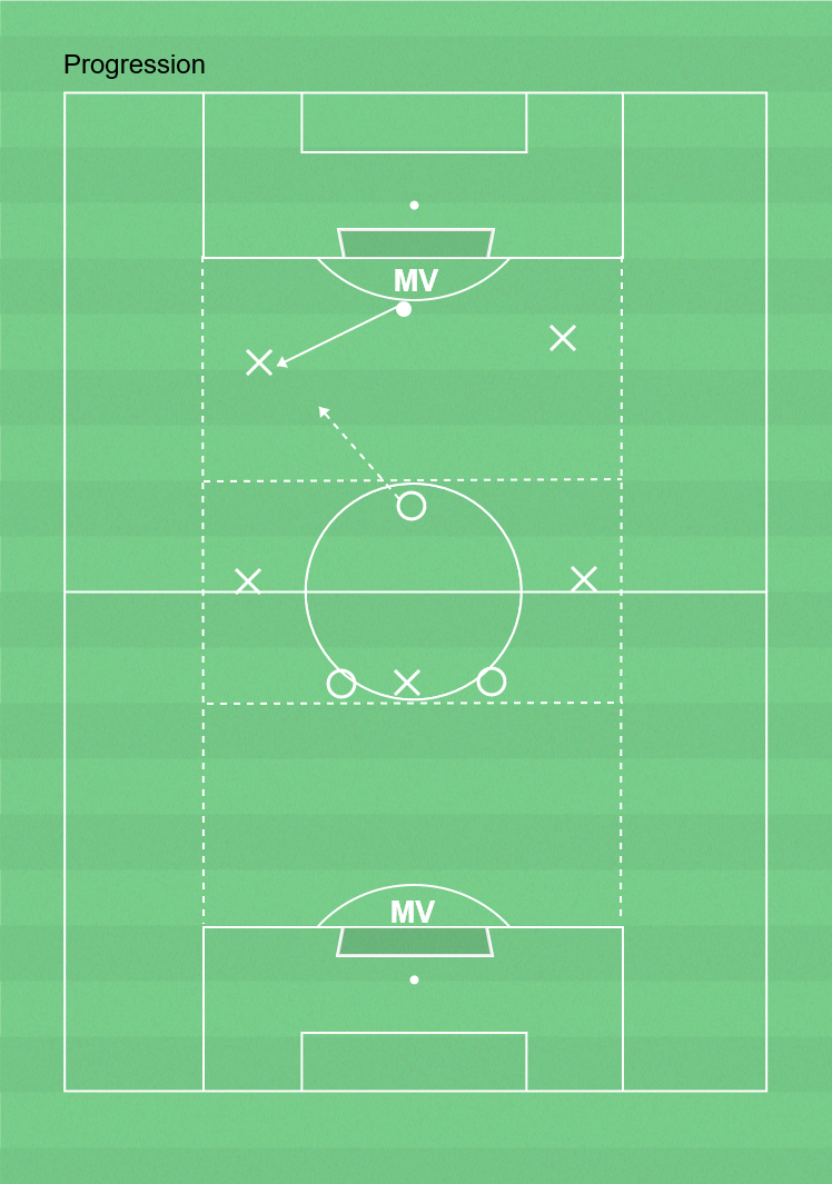 1 lag med boll har som uppgift att spela bollen från egen MV till motsatt MV. Försvande lag startar i den centrala tredjedeln men när måvakten startar spelet får en spelare springa in och pressa i lagets sista tredjedel. Försvarande lags uppgift är att ta bollen, kontra och göra mål. Anfallande lag får återerövra bollen efter bollförlust.