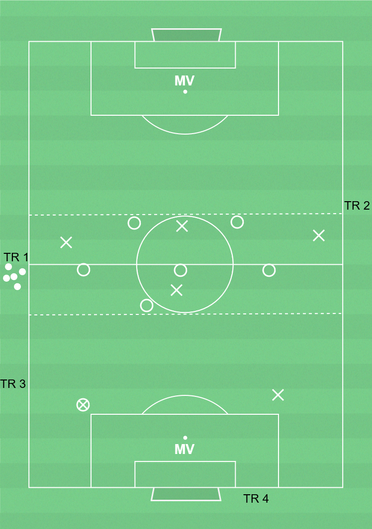 Det anfallande lagets uppgift är att spela bollen förbi försvarna till den sista 1/3. Det försvarande lagets uppgift är att erövra bollen och kontra. När bollen spelas till den sista 1/3 eller när det försvarande laget erövrar bollen övergår övningen i fritt spel.