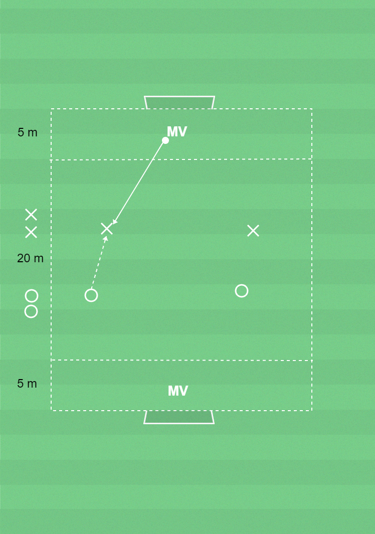 Spel 2 mot 2 + målvakter. Målvakterna är bakom en linje där endast målvakterna får vara. Det är tillåtet att passa till målvakten i sitt lag.