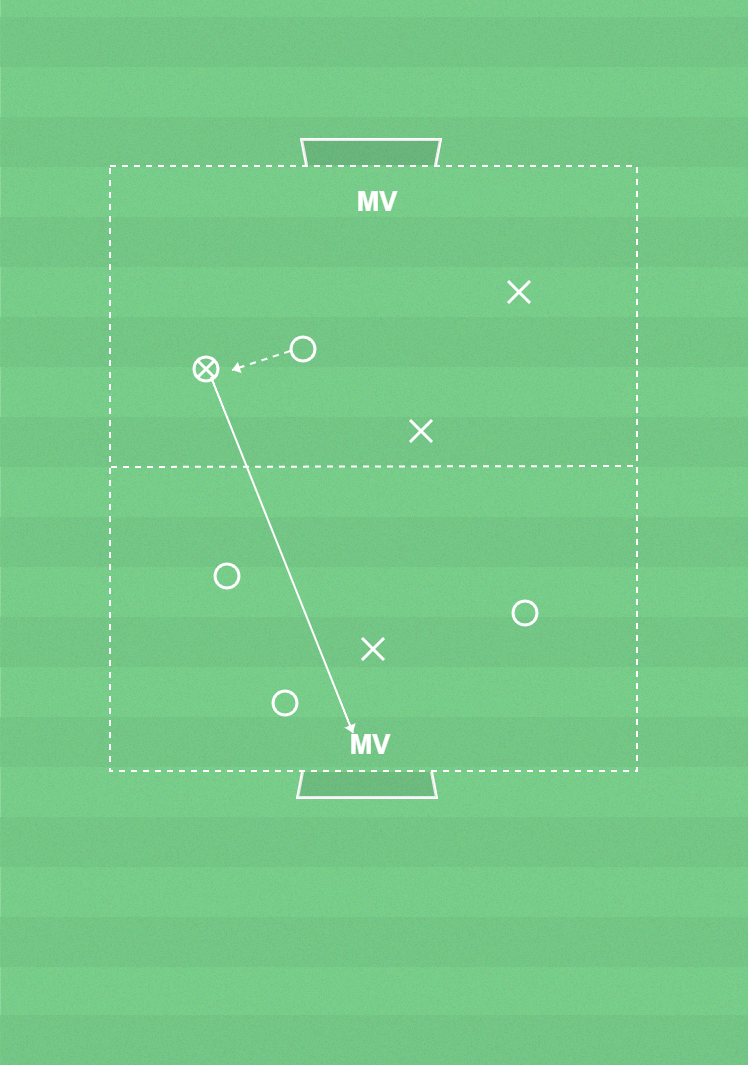 Uppgiften är att göra mål från egen planhalva. 2 lag med lika många i varje. Lagen spelar 3+MV mot 1 på sin egen planhalva och försöker göra mål därifrån. Spelaren på offensiv planhalva har som uppgift att bryta för att sedan avsluta eller spela tillbaka bollen till egen planhalva. Den här spelaren får även göra mål på returer.