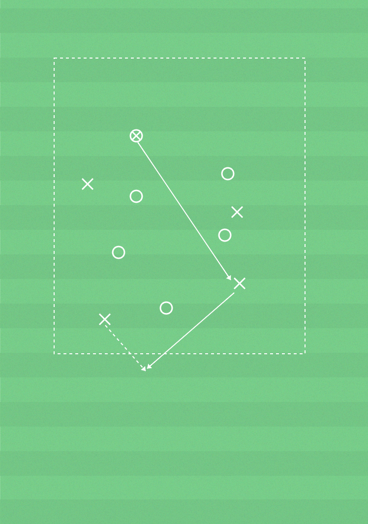 Uppgiften i övningen är att göra mål genom att fånga och doppa bollen i marken bakom motståndarnas kortlinje. Spelarna får inte springa med bollen och varje gång en spelare fångar bollen måste den doppas i marken innan den kastas vidare. 2 lag med lika många i varje.