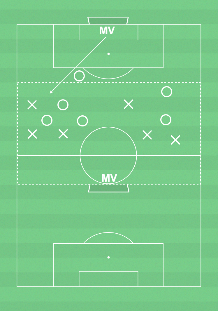 Spel 6 mot 4 med 2 kontringsspelare. Mv1 gör ett utkast till en medspelare på offensiv planhalv.