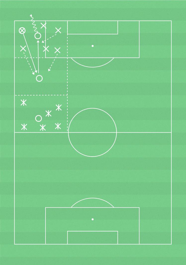 9-16 spelare, yta 36x15m (använd sidlinje + utsidan av straffområdeslinje), bollar, västar, konor.