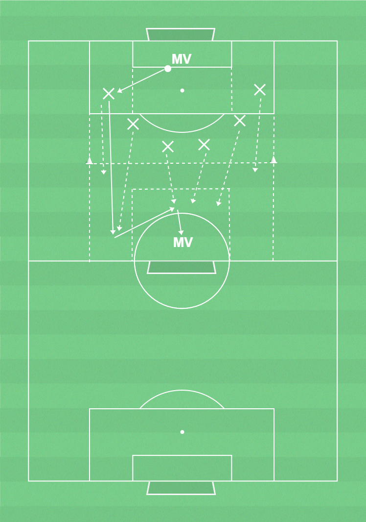Laget spelar bollen från MV till MV. Mittlinje fungerar som offsidelinje. Efter att kommit in på offensiv planhalva ska spelarna fylla på med löpningar in i goldzon. Passning sker utanför goldzon till goldzon där bollen spelas till MV på olika vis. Övningen vänder sedan från MV och går åt andra hållet.