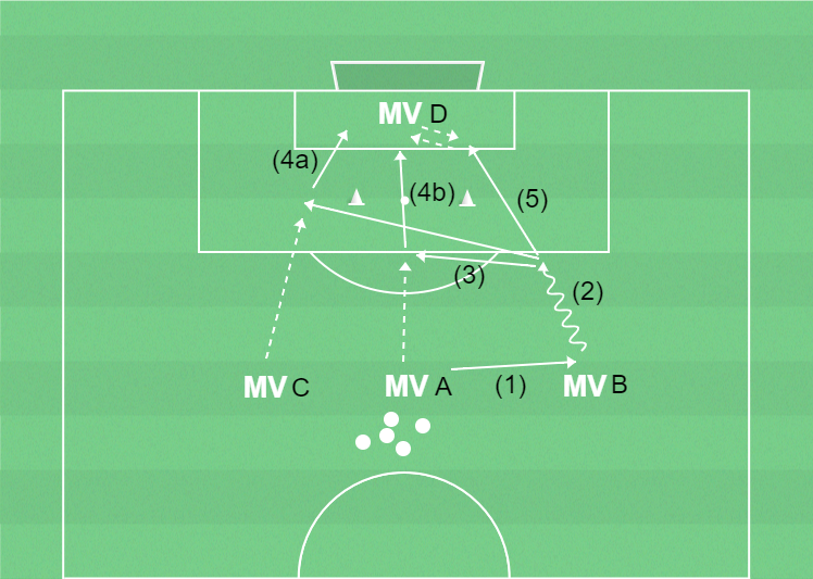 MvA passar bollen till MvB (1) som driver bollen mot målet (2). MvB passar bollen till MvA eller till MvC (3). MvD korrigerar sin position i förhållande till bollen. MvA eller MvC avslutar mot MvD med ett tillslag (4a/4b). MvB kan välja att själv avsluta vilket bör ske mer sällan (5).