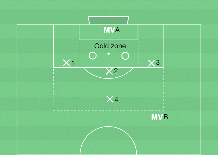 Spel 4 mot 3 där X4 inte får vara inne i straffområdet. X1-X3 ska sträva efter att komma till avslut i gold zone. X4 kan avsluta utanför straffområdet. Om MvA eller någon av de försvarande utespelarna erövrar bollen ska den spelas till MvB. 1 minuts spel därefter 1 minuts vila. Byt målvakt efter varje match.