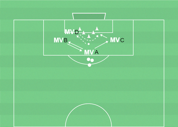 MvA, MvB och MvC passar en boll till varandra med ganska hög fart i en V-formation utanför triangeln med koner. MvD förflyttar sig i sidled längs triangelns långsidor. Någon av MvA, MvB eller MvC ska efter maximalt fem passningar försöka skjuta ner någon av konerna i triangeln. MvD skyddar konerna och blockerar avslutet. Byt målvakt efter tre avslut.