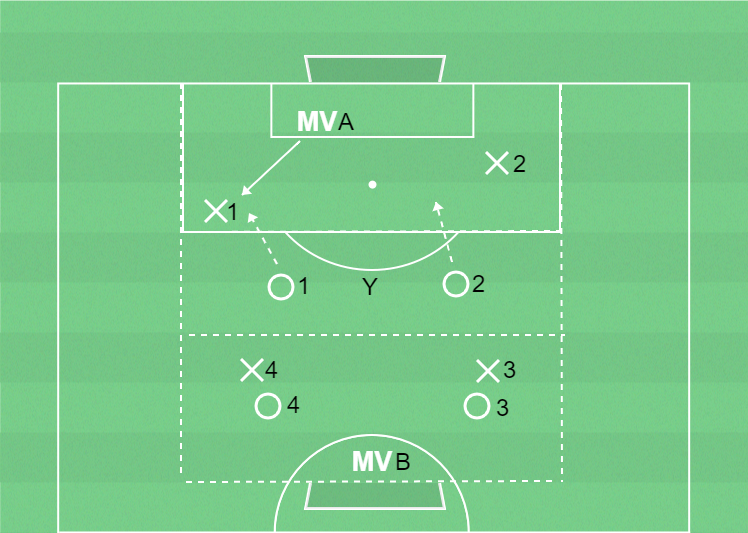 MvA gör en inspark till X1 eller X2. O1 och O2 går in i straffområdet där det blir spel 3 mot 2. MvA, X1 och X2 ska sträva efter att passa till Y i mittzonen. Y spelar eller driver in bollen i anfallszonen där det blir spel 3 mot 3 för att komma till avslut. Om O3, O4 eller MvB erövrar bollen vänder spelet (inspark eller speldjup bakåt). Y återgår till mittzonen och spelar med det bollhållande laget.