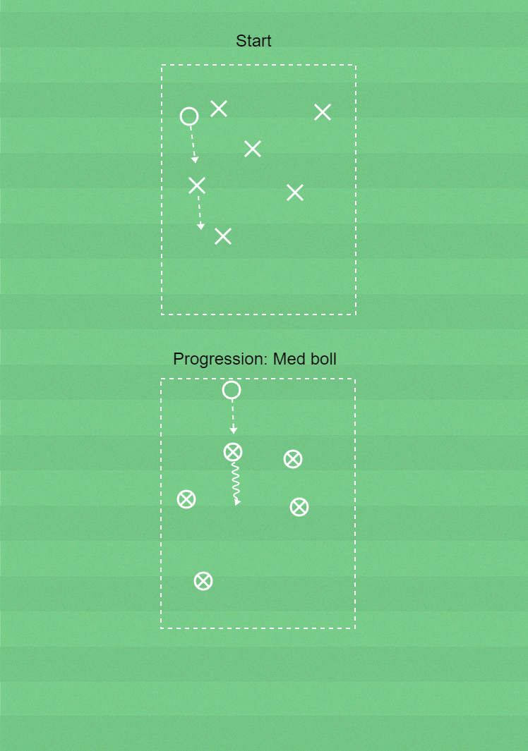 Ca 6 spelare, yta 10-12x7m, bollar, västar