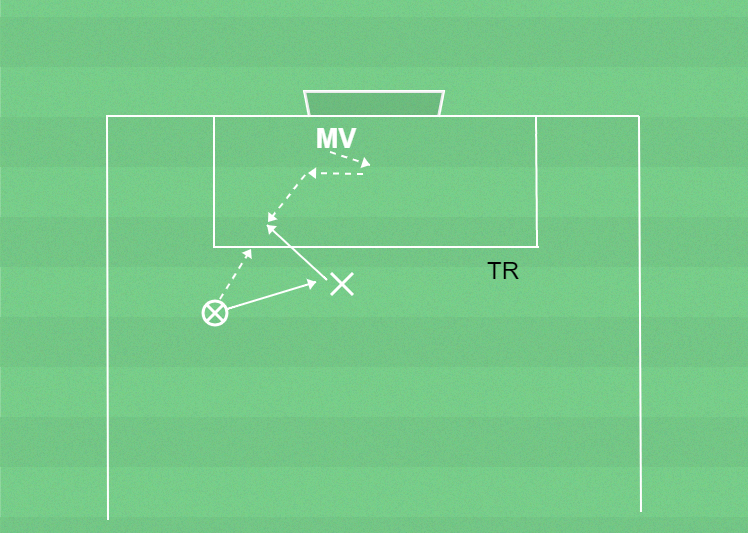 Bollhållaren passar till medspelare som spelar bollen till ytan mellan målvakten och utespelaren. Målvakten följer bollen i sidled, springer snabbt ut, fångar bollen och kastar den till tränaren. Byt uppgifter efter tre skott.