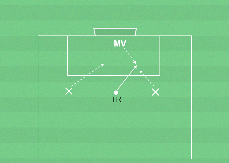 Två spelare utanför straffomårdet och en målvakt i straffområdet. Tr passar en boll till ytan mellan målvakten och en av utespelarna. Målvakt ska möjligt komma ut och bryta bollen innan den når motspelaren och annars rädda avslut. Spelaren passningen går mot försöker göra mål och den andra spelaren intar position för eventuell retur.
