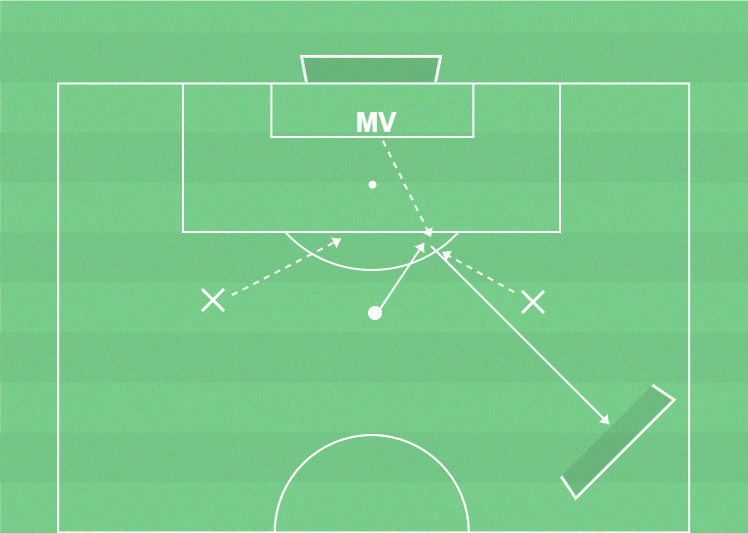 Två spelare utanför straffomårdet och en målvakt i straffområdet. Tr passar en boll till ytan mellan målvakten och en av utespelarna. Målvakt ska möjligt komma ut och bryta bollen innan den når motspelaren och annars rädda avslut. Spelaren passningen går mot försöker göra mål genom att komma före målvakten och avsluta på ett tillslag eller genom att finta och dribbla förbi målvakten. Den andra spelaren intar position för eventuell retur.