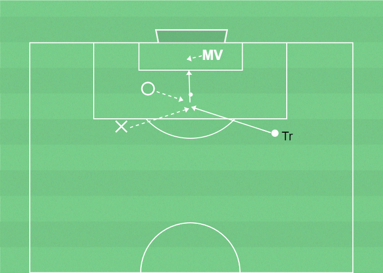 Tr passar bollen mot golden zon och mellan en anfallare och en försvarare. Anfallaren springer mot bollen och försöker avsluta på så få tillslag som möjligt, helt ett. Försvararens uppgift är att täcka en del av målet och försöka blocka avslutet. MV kommunicerar med försvarare och täcker den andra delen av målet.
