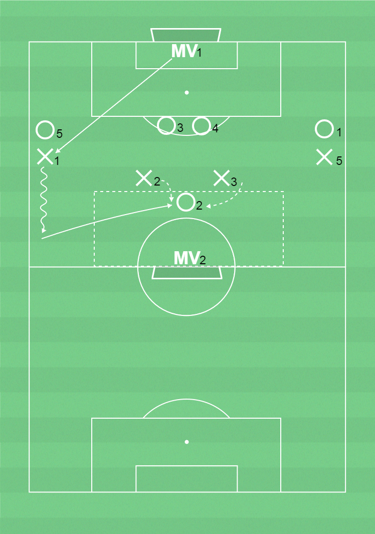 Mv1 kastar ut bollen till X1 som slår ett inlägg mot X2 och X3.