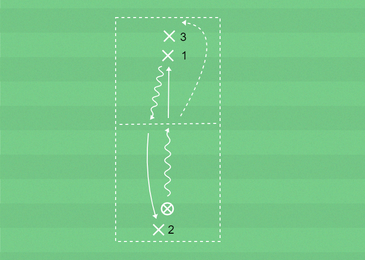 X1 driver bollen till linjen och skjuter på marken till X3 som fångar bollen och så vidare.