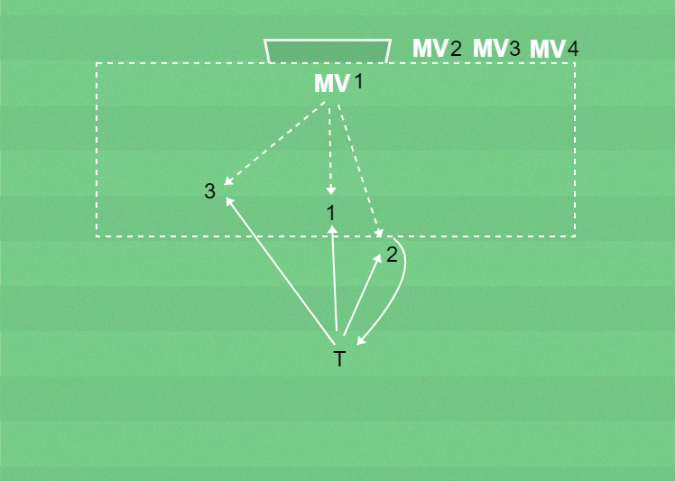 Du som tränare spelar bollen mot målet. Mv1 bryter djupledspassningen och fångar bollen (1). Om målvakten når bollen utanför straffområdet tar hen emot bollen och passar den till dig (2). Därefter är det dags för Mv2 och så vidare.