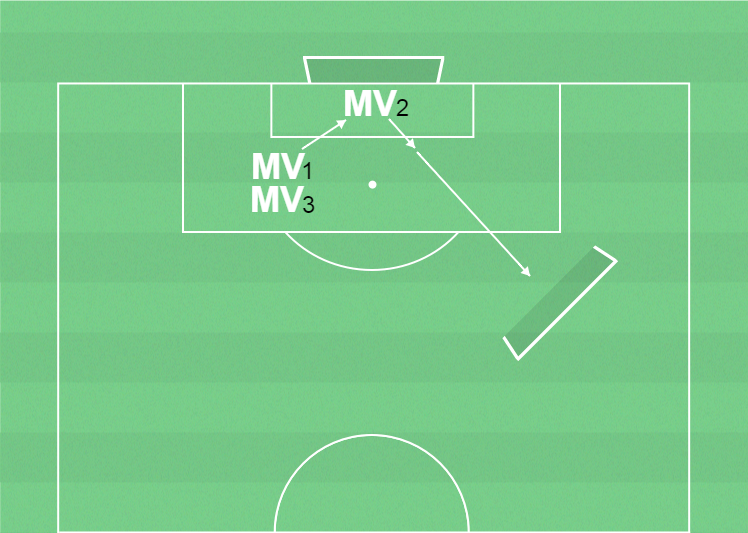 Mv3 kastar bollen till Mv1 som ett inlägg.