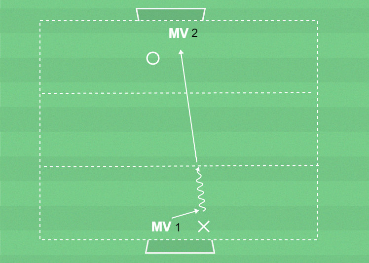 Mv1 rullar ut bollen till sin medspelare som driver bollen och avslutar i egen försvarszon mot Mv2.