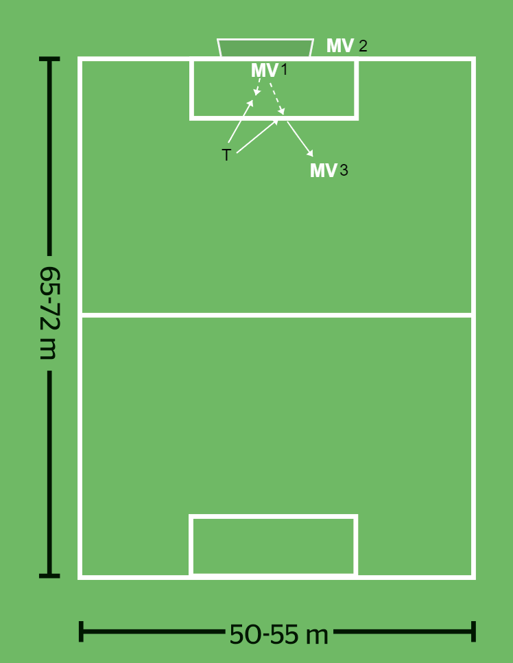 Om målvakten får bollen utanför straffområdet passar hen den till Mv3 som förflyttar sig åt olika håll utanför straffområdet.