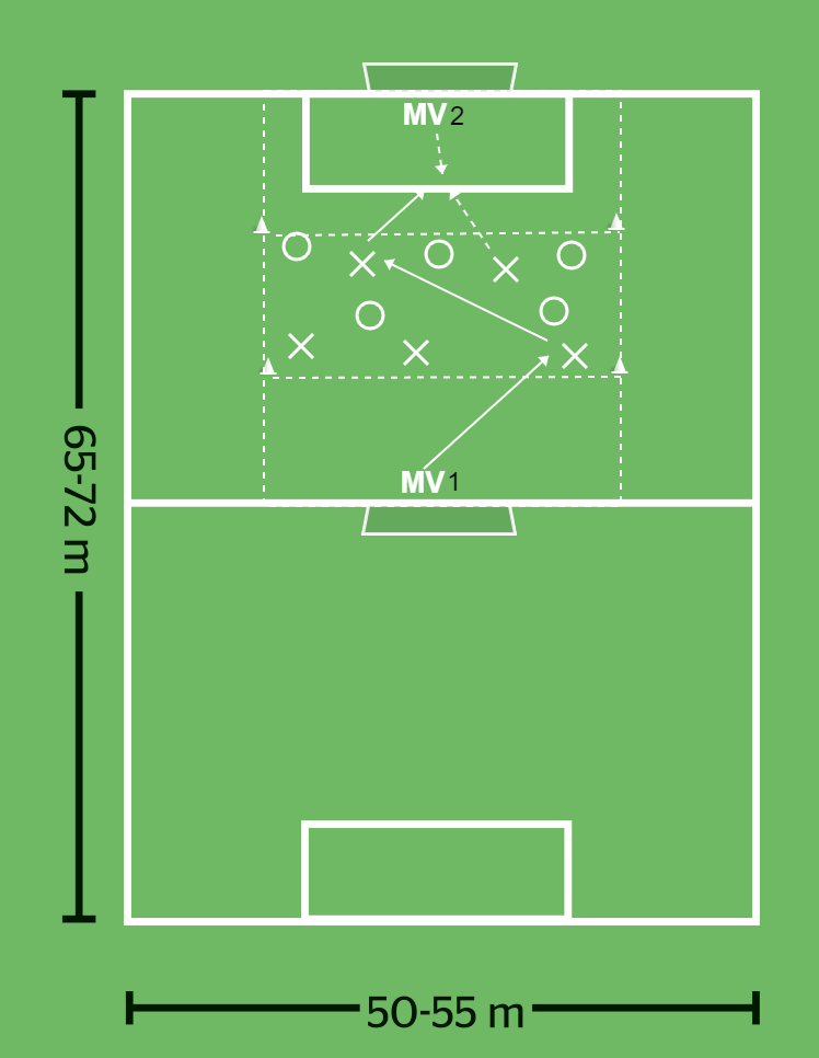 Två målvakter, tio utespelare; spelplan 30 x 35 meter med två mål; bollar, koner och västar.