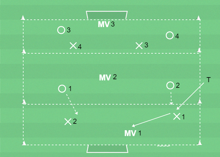 Mv1, X1 och X2 spelar in bollen i mittzonen till Mv2 som tar in bollen i anfallszonen där det blir spel 3 mot 2 för att göra mål på Mv3.