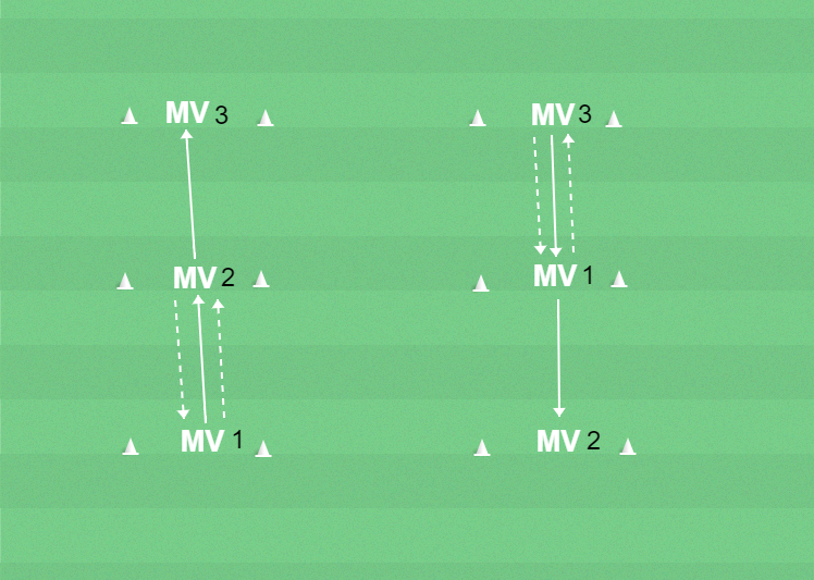 Mv3 skjuter bollen till Mv1 som fångar bollen.